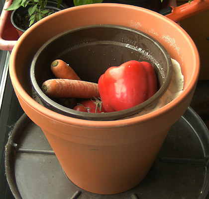 Ich habe den in einem früheren Beitrag beschriebenen stromlosen „Kühlschrank“ in einer modifizierten Variante nachgebaut: aussen ein Blumentopf aus unglasiertem Ton, innen einer aus Kunststoff, dazwischen feuchter Sand. Allerdings bildet sich innen Kondenswasser, was zwar anzeigt, dass es dort wirklich kühl ist, aber vielleicht würde das nicht passieren, wenn der innere Topf ebenfalls aus Ton wäre. Das werde ich noch klären.