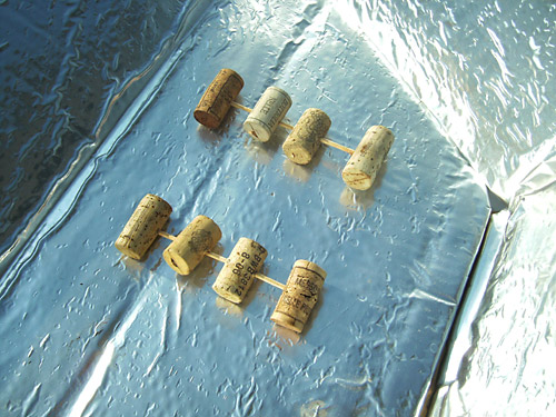Ich baute meinen Sonnensegelkocher nach dem CookIt-Design von SCI auf dem Balkon auf, stellte den Gänsebräter mit ca. 5 Liter Wasser auf selbstgebaute Korkuntersetzer (s. u.), legte das Backofenthermometer auf den Deckel und verschloss den Kochraum mit zwei Lagen der Plastikfolie. Trotz vieler Wolken zeigte das Thermometer bald 80°C bei ca. 30°C Aussentemperatur, und das Wasser war so heiss, dass ich es zum Geschirrspülen mit kaltem Wasser auf ein erträgliches Maß herunterkühlen musste.