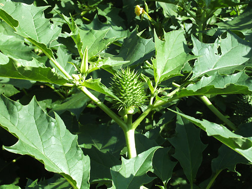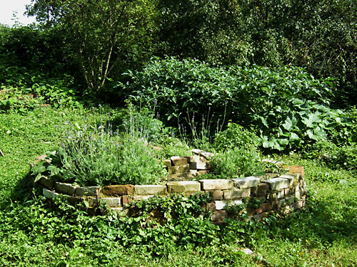 Oben sieht man die Kräuterspirale vor einer selbst ausgesähten Kolonie von sehr dekorativem Stechapfel (Datura stramonium).  Ich kannte die Datura vorher nur von Castaneda, und wusste gar nicht, dass sie auch hier wächst, aber eine kundige Ökotopianerin hat mich darüber aufgeklärt, was sich da bei mir ausgesät hat  🙂