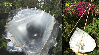 Die letzten Tage habe ich zu Temperaturmessungen genutzt. Mein Backofen-Thermometer zeigte im mit Malerabdeckfolie eingehüllten Segelkocher (Bild links) eine Temperatur von 70°C, im Trichterkocher (Bild rechts) zeigte das ins schwarz angestrichene Einmachglas hineingestellte Thermometer nach etwa einer halben Stunde eine Temperatur von 80°C, die stundenlang konstant blieb.