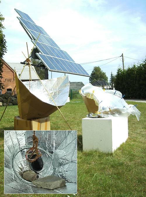 Um den riesigen Trichterkocher in Form zu halten, kam ich auf die Idee, ihn mit einem Metallring zu stabilisieren. Ditmar Schmidt vom Solarzentrum besorgte mir einen Ring, mit dem an großen runden Farbeimern die Deckel befestigt werden. Mit Blumendraht fixiert, hielt er den Trichter in Kreisform. Der rechteckige Karton, der als Halterung dient, verformt den Trichter nämlich ein wenig, was den Wirkungsgrad verringern dürfte. Wie das eingesetzte kleinere Foto zeigt, waren schwere Steine nötig, um den Kocher gegen den sehr heftig blasenden Wind festzuhalten. Das schwarze Glas habe ich nach dieser Aufnahme noch in einen Bratschlauch gesteckt.
