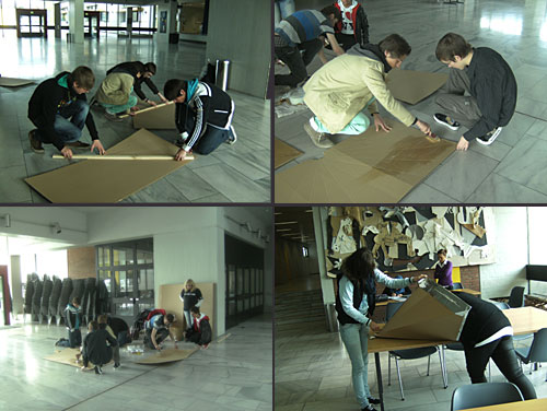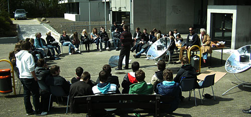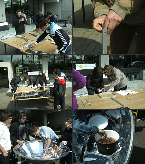 Ähnlich wie im Januar im Bonner Beethovengymnasium simulierten die Schüler/innen anhand des Weltklimaspiels „Cooling Down“ eine Weltklimakonferenz. Abwechselnd pausierten einige von ihnen, um Trichterkocher zu bauen bzw. einen Parabolspiegelkocher aus einem Bausatz zusammenzusetzen.