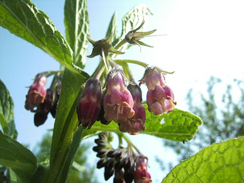 Mein Garten ist ein guter Standort für Beinwell, der hier üppig wächst. Hier die Sorte mit den rötlicheren Blüten. Ich habe auch noch Pflanzen mit einem stärkeren Blaustich.