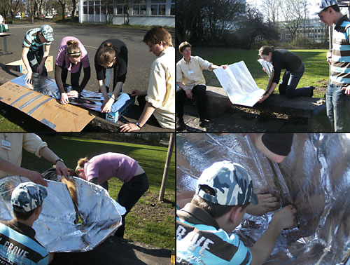 Gestern, am UNESCO-Tag, war ich mit der Solarkochschule im Bonner Robert-Wetzlar-Berufskolleg, einer UNESCO-Projektschule. Das Foto oben zeigt Schüler/innen beim Bau eines Trichterkochers. Im mitgebrachten Trichterkocher stieg das Thermometer bis auf 100° C, vom strahlend blauen Himmel schien die ganze Zeit die Sonne. Im Unterschied zur Aktion im Beethovengymnasium vor anderthalb Wochen war es allerdings schon später als 16 Uhr, so dass die Sonne tiefer stand und der damalige Temperaturrekord ungefährdet blieb.