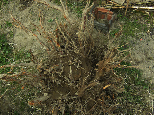 Wie ich von meiner Feng Shui-Beraterin erfahren habe, stellen Baumstümpfe nämlich üble Störstellen dar, die unbedingt entfernt werden müssen. Und da genau an dieser Stelle bald die Kompostkiste aufgebaut werden soll, war diese Aktion auch kurzfristig nötig. Nachdem ich gestern dieses Konglomerat aus Wurzeln, Baumstümpfen und Erde soweit freigelegt hatte, dass es nicht mehr im Untergrund fest hing, konnte ich es heute mit der tatkräftigen Unterstützung meines Gartennachbarn Thomas aus der Grube heben und beiseite räumen. Nun brauche ich noch eine gute Idee, was weiter mit dem Ding anzufangen ist: