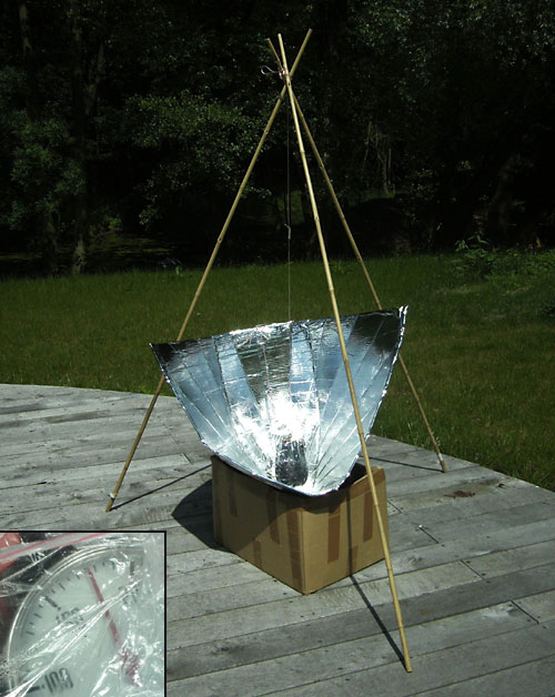 Sinn der Sache war, zum einen ein mechanisch stabileres Material als das bisherige zu finden, andererseits zu sehen, ob die Reflexionseigenschaften der Rettungsfolie in irgendeiner Richtung von der Haushalts-Alufolie abwichen. Der fertige Kocher von 75 cm x 150 cm schien mir stärker zu glänzen als die bisherigen, und tatsächlich, an einem wolkenlosen Montag, der sich zusätzlich noch durch völlige Windstille auszeichnete, kletterte das Thermometer im Kocher auf einen neuen Rekordwert von knapp über 175°C.