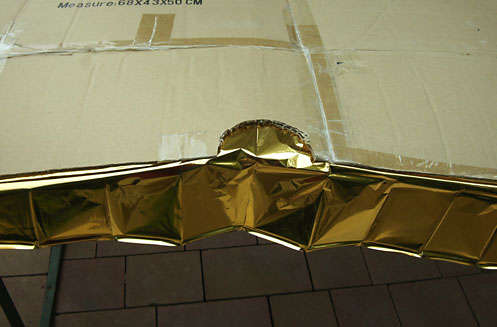 Unten sieht man am halbfertigen Kocher noch einen Teil der goldenen Rückseite der Folie, die ich mit Sprühkleber befestigt habe. Die „Rettungsdecke, gold/silber, 210 x 160cm, nach DIN“ habe ich bei HASAMED gefunden.