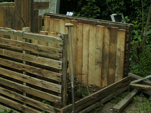 Ausserdem habe ich von erfahrenen Ökotopianern gelernt, dass die Wände einer Kompostkiste möglichst wenig Luft durchlassen dürfen, weil der Kompost sonst austrocknet. Ich hatte mir kürzlich schon einige Bretter besorgt, die ich heute auf die Innenseite der Paletten nageln konnte, aus denen die Kiste bisher nur bestand. Nun benötige ich noch ein paar etwas längere Bretter für die Vorderseite. Bin ja mal gespannt!