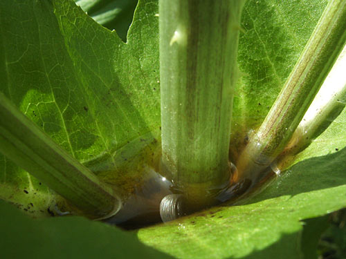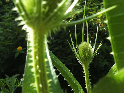 Im Garten haben sich ein paar Exemplare der Wilden Karde (Dipsacus fullonum L., Syn. Dipsacus sylvestris Huds.) angesiedelt, einer sehr schönen zweijährigen distelähnlichen Pflanze.