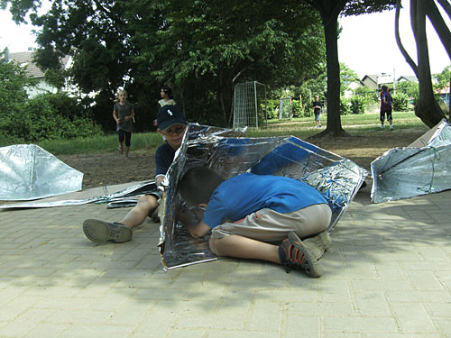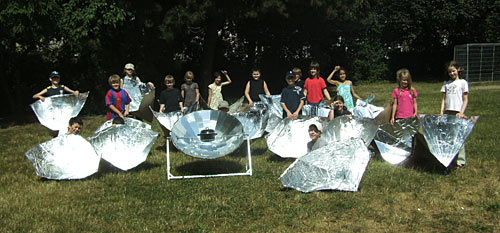 19 Jungen und Mädchen der Grundschule Troisdorf-Sieglar haben heute in kürzester Zeit in Gemeinschaftsarbeit 19 Trichterkocher gebaut. Das Team der Solarkochschule war über die Geschicklichkeit von Frau Schäfers Klasse begeistert!