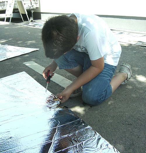Am vergangenen Samstag waren wir mit der Solarkochschule ein zweites Mal in der Grundschule Troisdorf-Sieglar. Diesmal bauten wir unseren Stand anlässlich des Schulfestes auf. In Backofenglut baute ich mit zwei Schülern, die am vergangene Dienstag nicht dabeisein konnten, zwei weitere Trichterkocher. Auf dem Bild oben sieht man, wie mit einem Kreuzschlitzschraubenzieher die Löcher für die Verbindung der beiden Seiten mittels Kordel gebohrt werden.