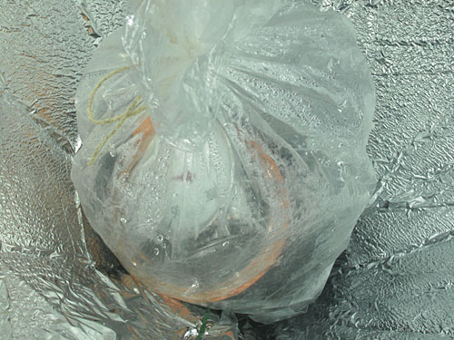 Ich hatte einen der am Dienstag gebauten Trichterkocher in die Sonne gestellt, darin ein Einmachglas mit ca. einem halben Liter Wasser. Nach etwa 2 1/2 Stunden kochte es, die Temperatur oberhalb des Glases betrug die ganze Zeit konstant 110°C. Unten ist gut das Kondenswasser zu erkennen, das sich auf der Innenseite des Bratschlauchs niederschlägt.