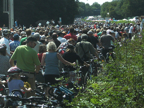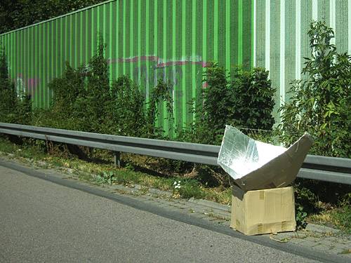 Heute präsentierte ich mit einigen weiteren Solarenthusiasten auf der gesperrten A40 in der Höhe der Ausfahrt DO-Kley diverse Solarkocher. Als wir aufbauten, stand mein Trichterkocher noch als Stilleben am Straßenrand und tankte Sonnenlicht, aber im Laufe des Tages strömten bei brütender Hitze die Massen vorbei, und viele Besucher wollten Näheres wissen. Bei blauem Himmel mit einzelnen Wolken kletterte das Thermometer im Kocher auf erstaunliche 155°C, und die perfekten Kartoffeln, die ich nach ca. 4 Stunden aus dem Kochglas holte, passten gut zum mitgebrachten Bärlauchquark.