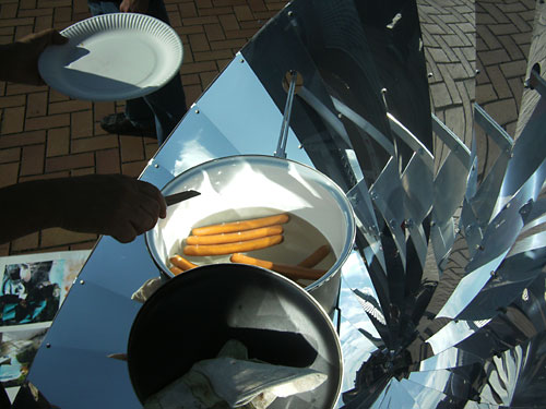 Gestern stand ich mit der Solarkochschule auf dem Schulfest „Kulturnacht – Nacht der Wissenschaften“ der Gesamtschule Hennef, wo wir zwei Tage zuvor die Trichterkocher gebaut hatten. Wir hatten den großen Parabolspiegel aufgestellt und machten darin bei kräftiger Sonnenstrahlung Würstchen heiss. Viele Besucher informierten sich über das solare Kochen und schauten sich auch fasziniert die Trichterkocher an.