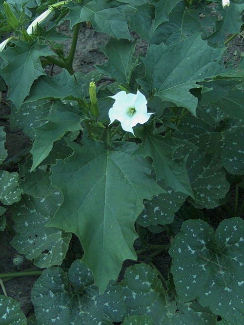 Es hat ein Weilchen gedauert, bis ich sie entdeckt habe, und ich dachte schon, die Daturas hätten letztes Jahr ein einmaliges Gastspiel gegeben, aber glücklicherweise sind die Pflanzen mit den wunderschönen weissen Blüten auch dieses Jahr wieder dabei. Die Aufnahme entstand heute nach Sonnenuntergang. Die gefleckten Blätter unter der Datura stramonium gehören zum Muskatkürbis, der sich anschickt, den ganzen Garten im Handstreich zu nehmen 🙂