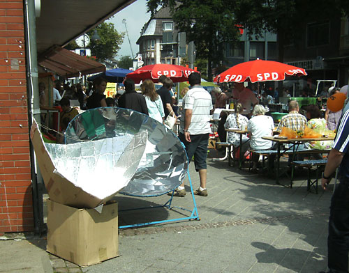 Die Sonne hielt sich am vergangenen Sonntag während des Stadtfests in Heiligenhaus bis zum Nachmittag verborgen. Ich hatte einen geliehenen K14, einen alten Koch-Kocher, der leider nicht mehr gebaut wird, dabei. Das ist ein Parabolspiegelkocher mit 1,40 m Durchmesser, der von einem soliden, am Boden rechteckigen Gestell gehalten wird. Im Unterschied zum SK14 mit seinem zugegebenermaßen eleganter aussehenden Dreibeingestell ist er deutlich windstabiler.