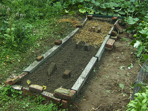 Zum Schluss habe ich das mit Balken und Steinen eingefasste Beet mit Kaninchendraht abgedeckt, damit die Vögel keine Chance haben.