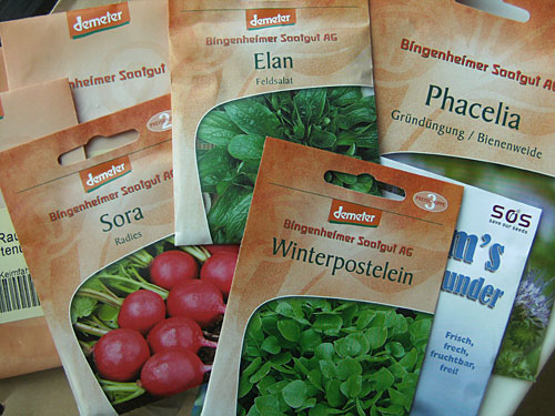 Bei den Bingenheimern hatte ich schon ein paar Tüten Saatgut bestellt (was übrigens 2 Tage nach Online-Bestellung da war), und heute war es dann soweit. Den ganzen Vormittag über und auch noch am frühen Nachmittag hatte es geregnet, so dass der Boden gut durchgeweicht war. Das erleichterte es mir, im Dschungel etwas Platz zu schaffen, weil sich die Pflanzen, die ich dort nicht haben wollte, leicht herausziehen liessen.